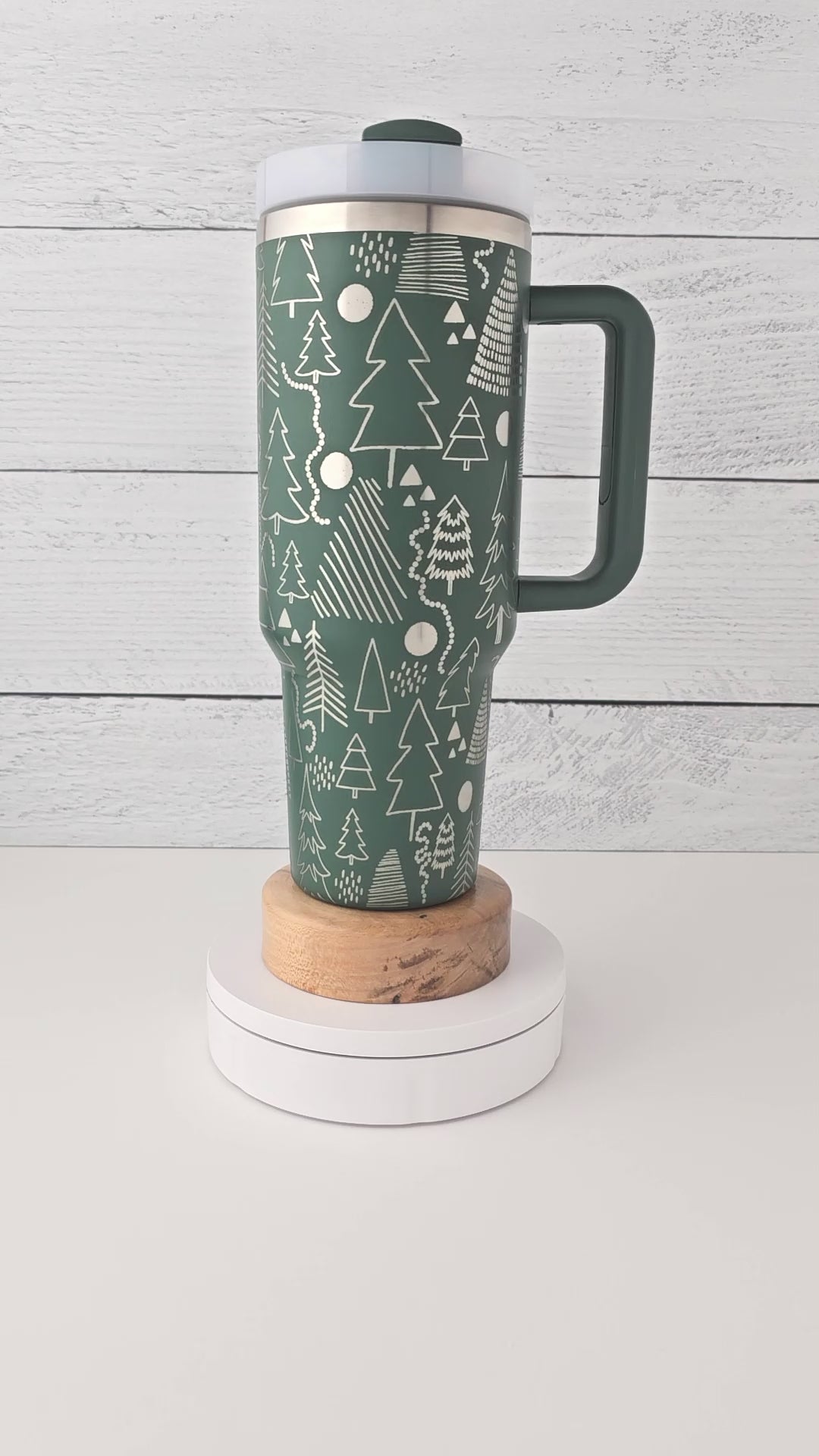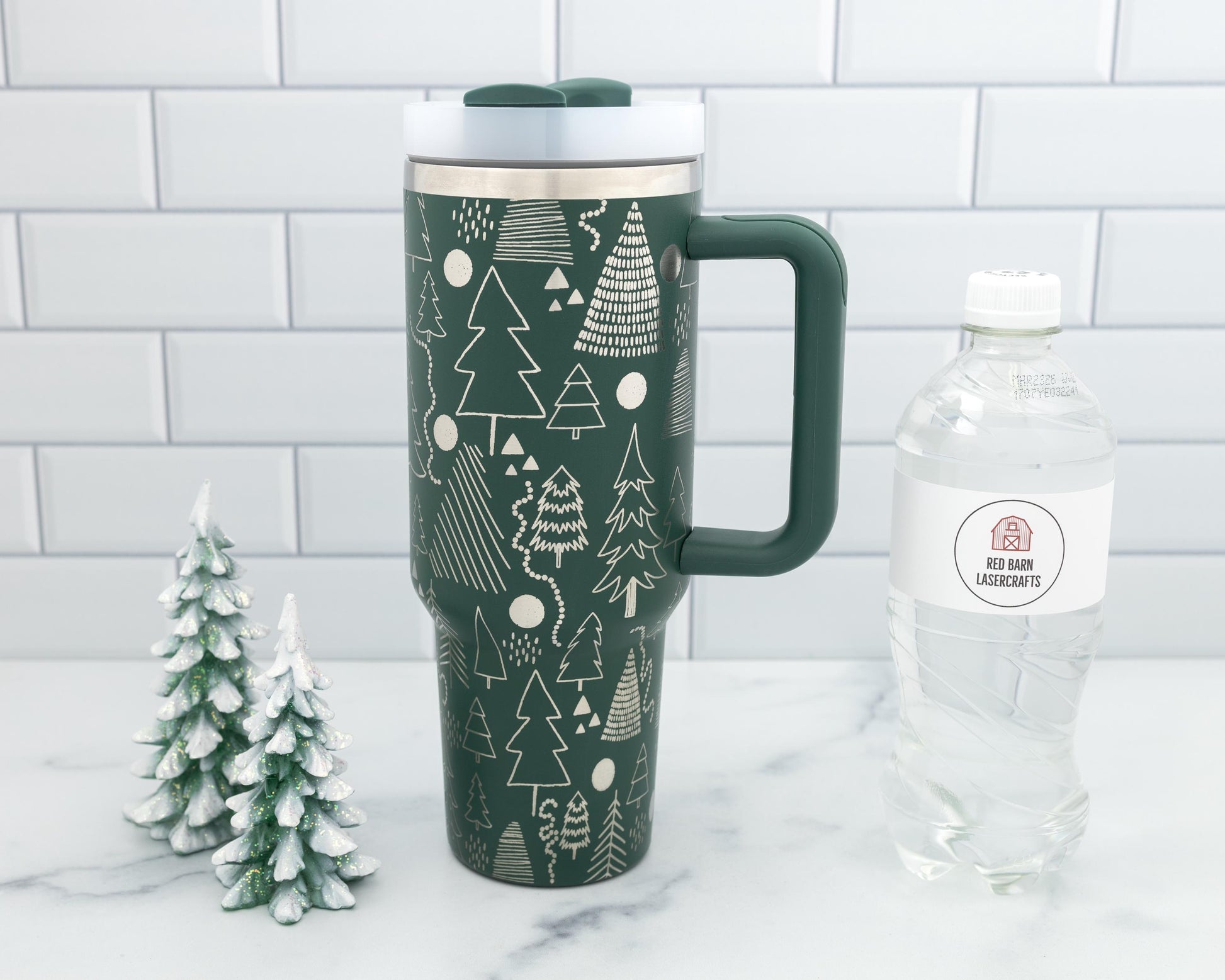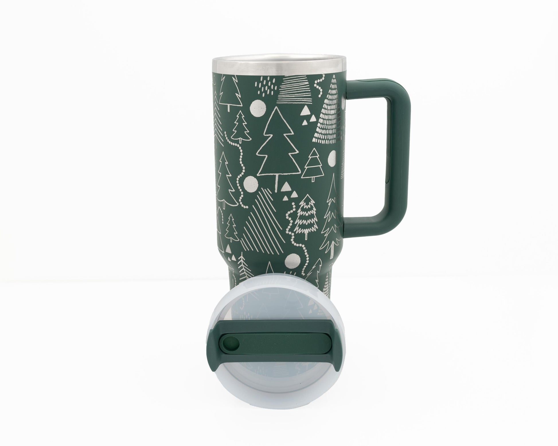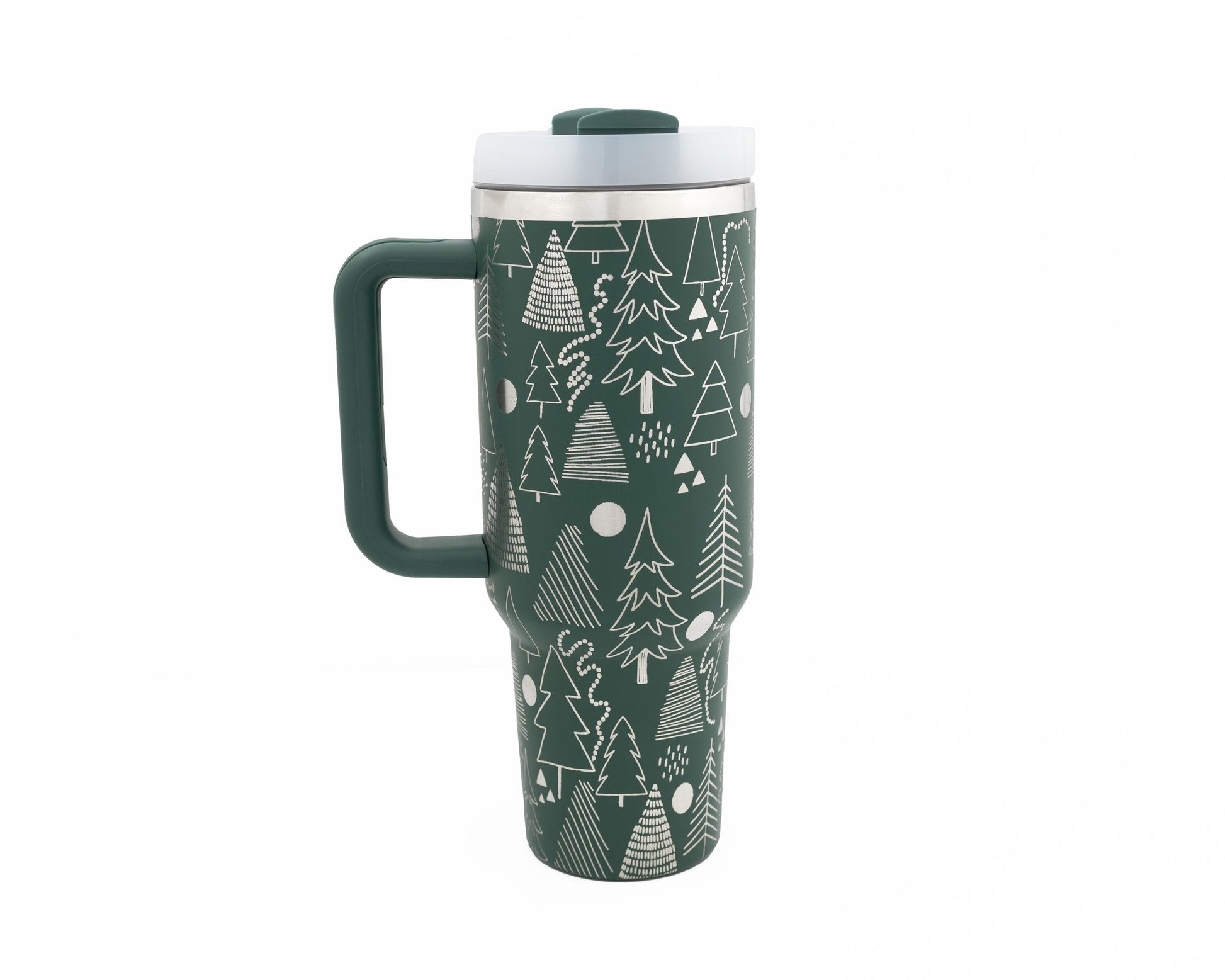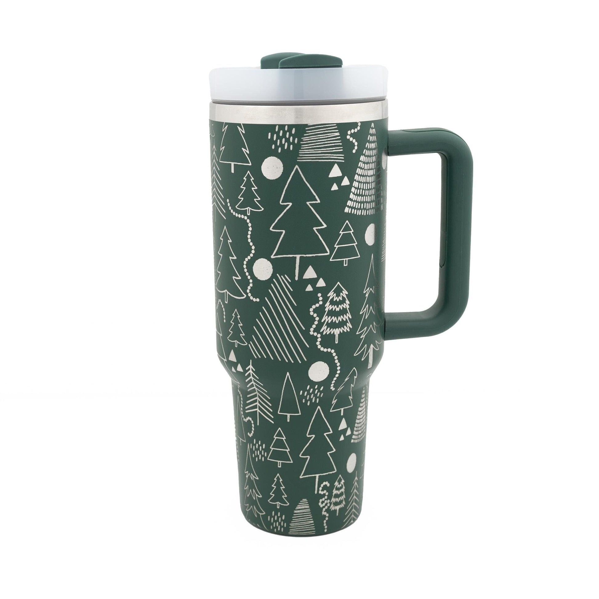 Crafted from durable stainless steel and engraved in-house, the design is permanently etched by removing the powder coating, revealing the gleaming steel beneath for a striking silver-on-green contrast. It’s a little forest of evergreen joy in your hands.