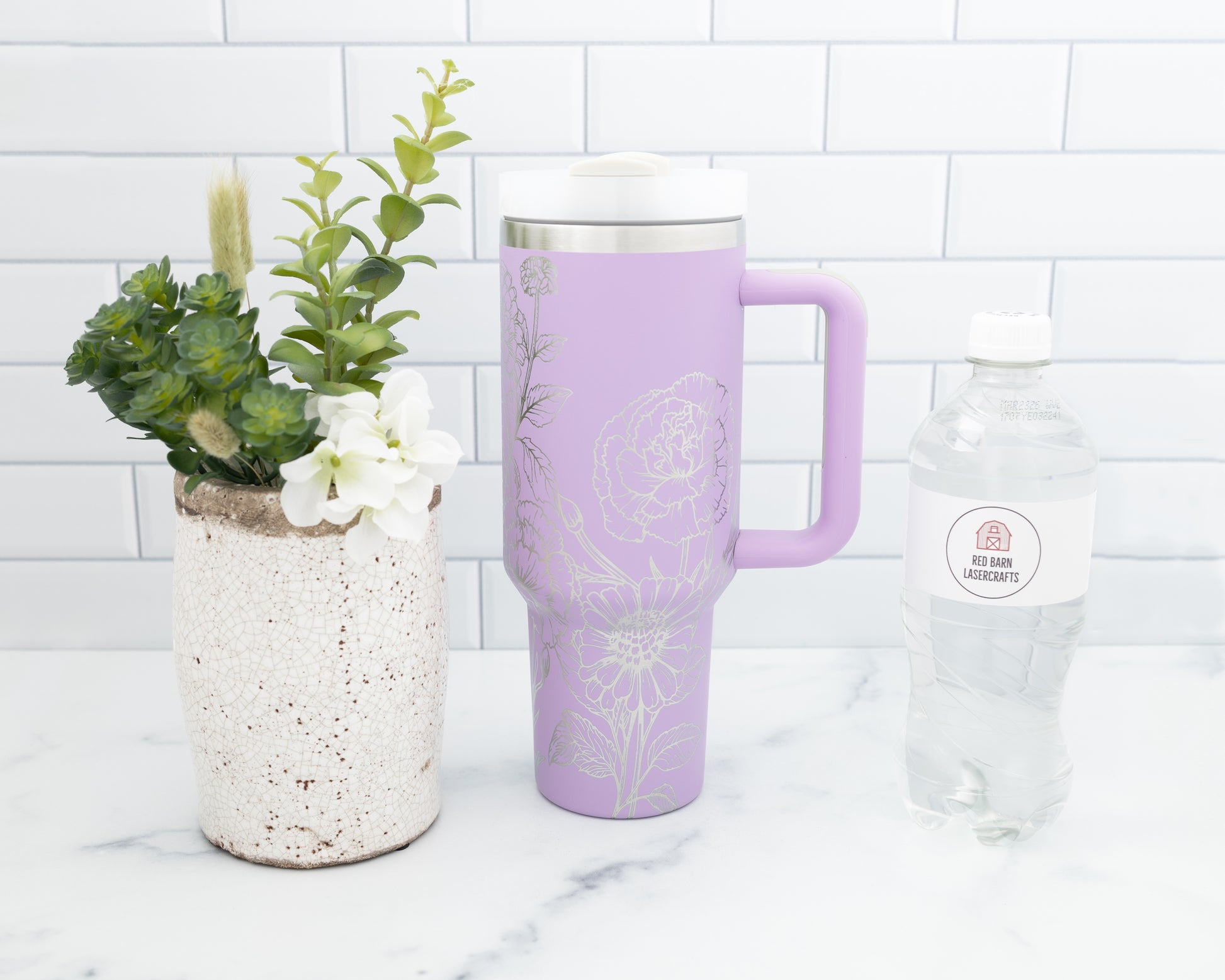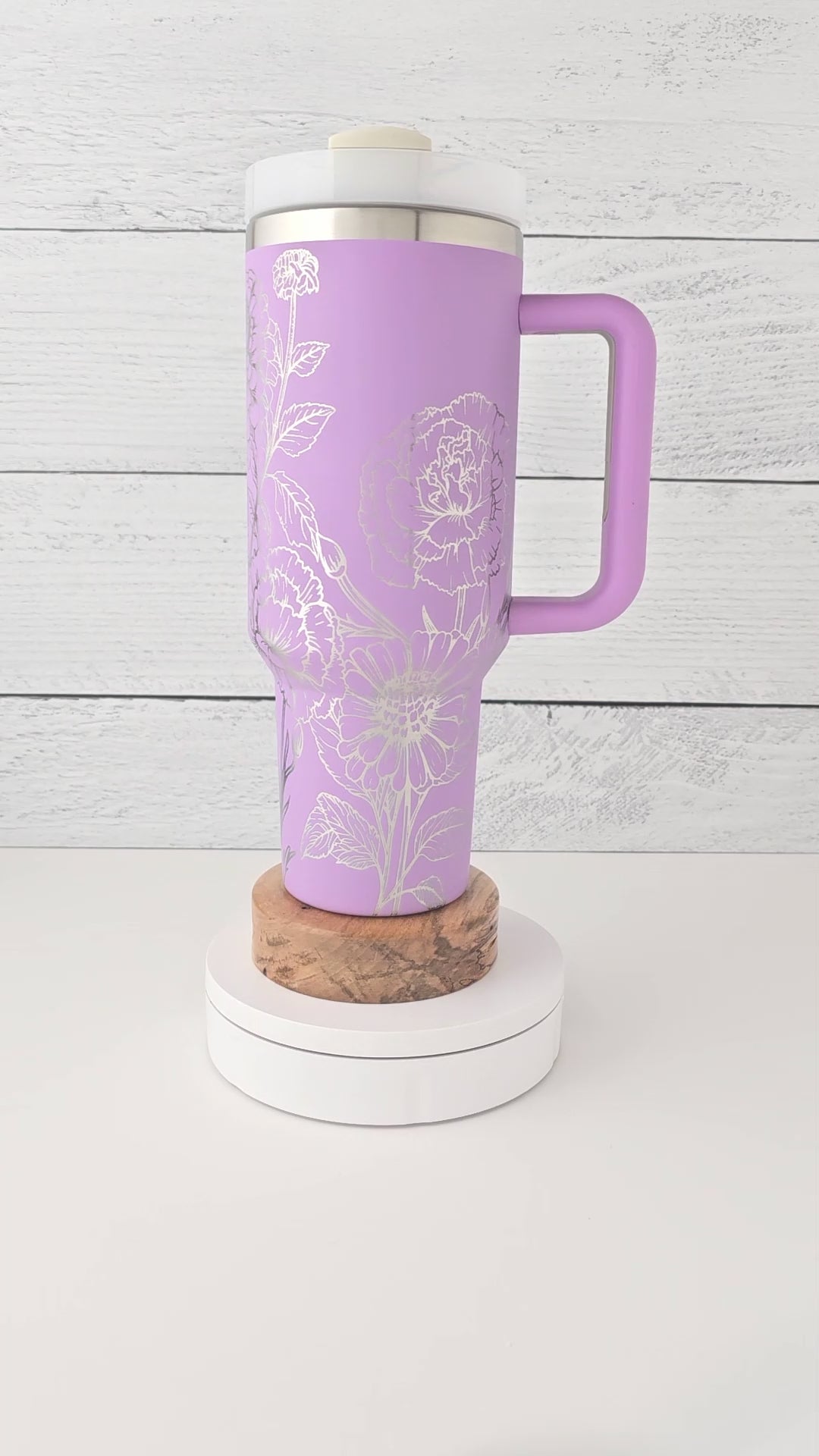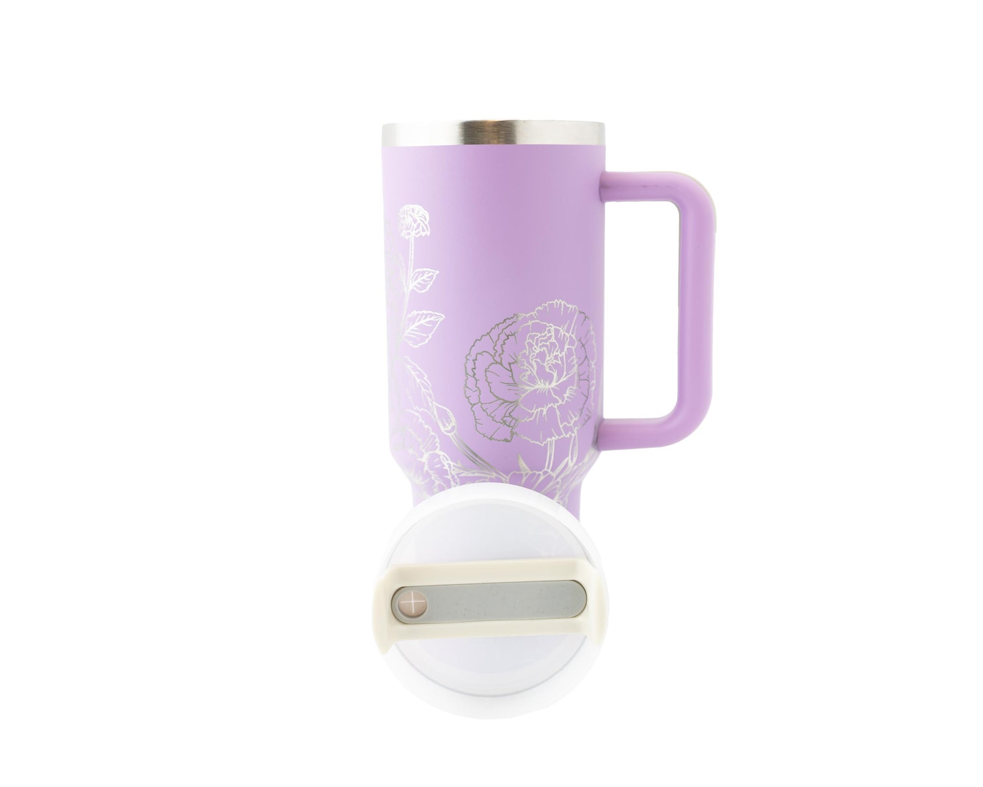 Crafted from durable stainless steel, this tumbler features a powder-coated finish and a comfortable handle for effortless portability. The precision laser engraving removes the outer color to reveal the gleaming steel beneath, giving the floral artwork a radiant silver look. With a reusable straw and a screw-on lid with 3 positions (closed, open, straw port), it’s built for both style and everyday functionality.