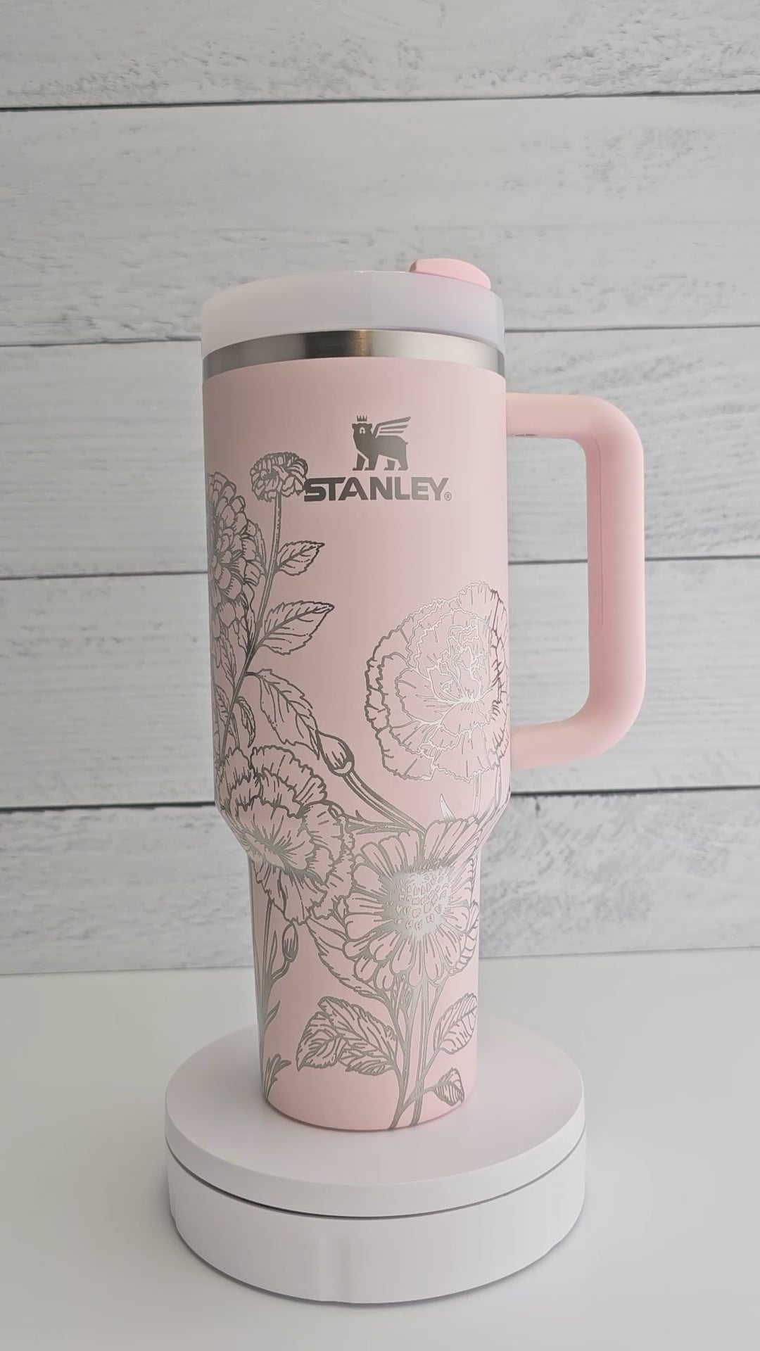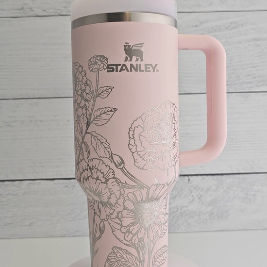 Celebrate the beauty of nature with our 40oz Stanley Quencher, elegantly laser engraved with a wraparound zinnia and carnation floral design. Whether you're sipping a hot latte in the garden or enjoying an icy drink on the go, this durable tumbler brings floral charm to every moment.