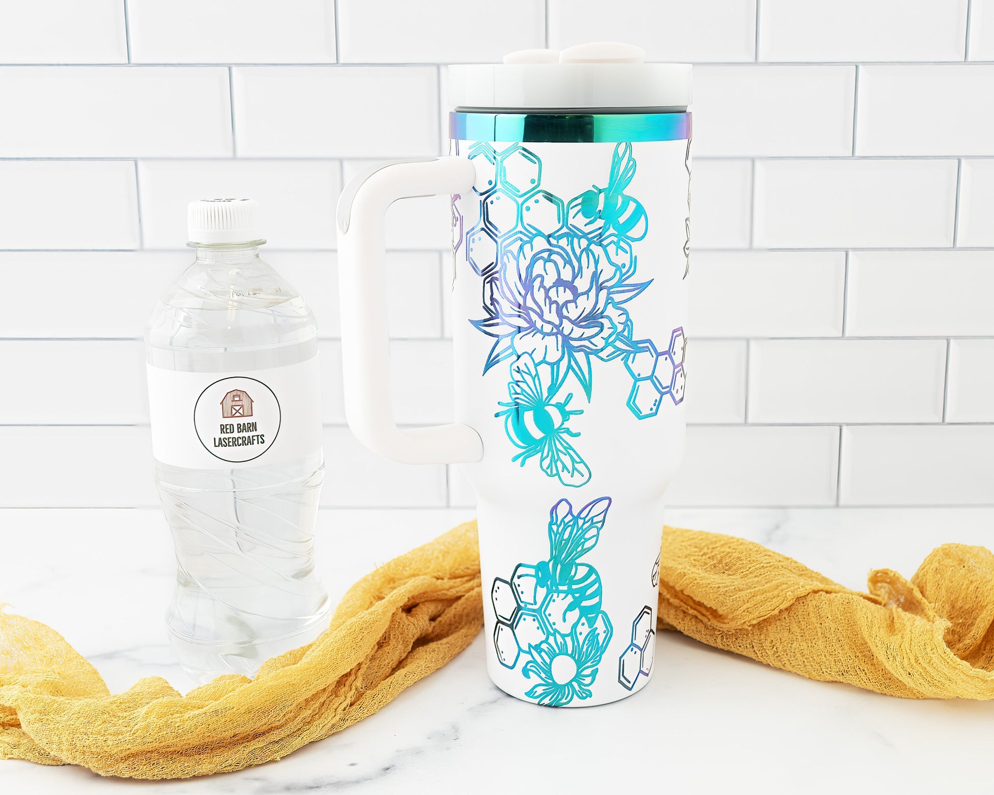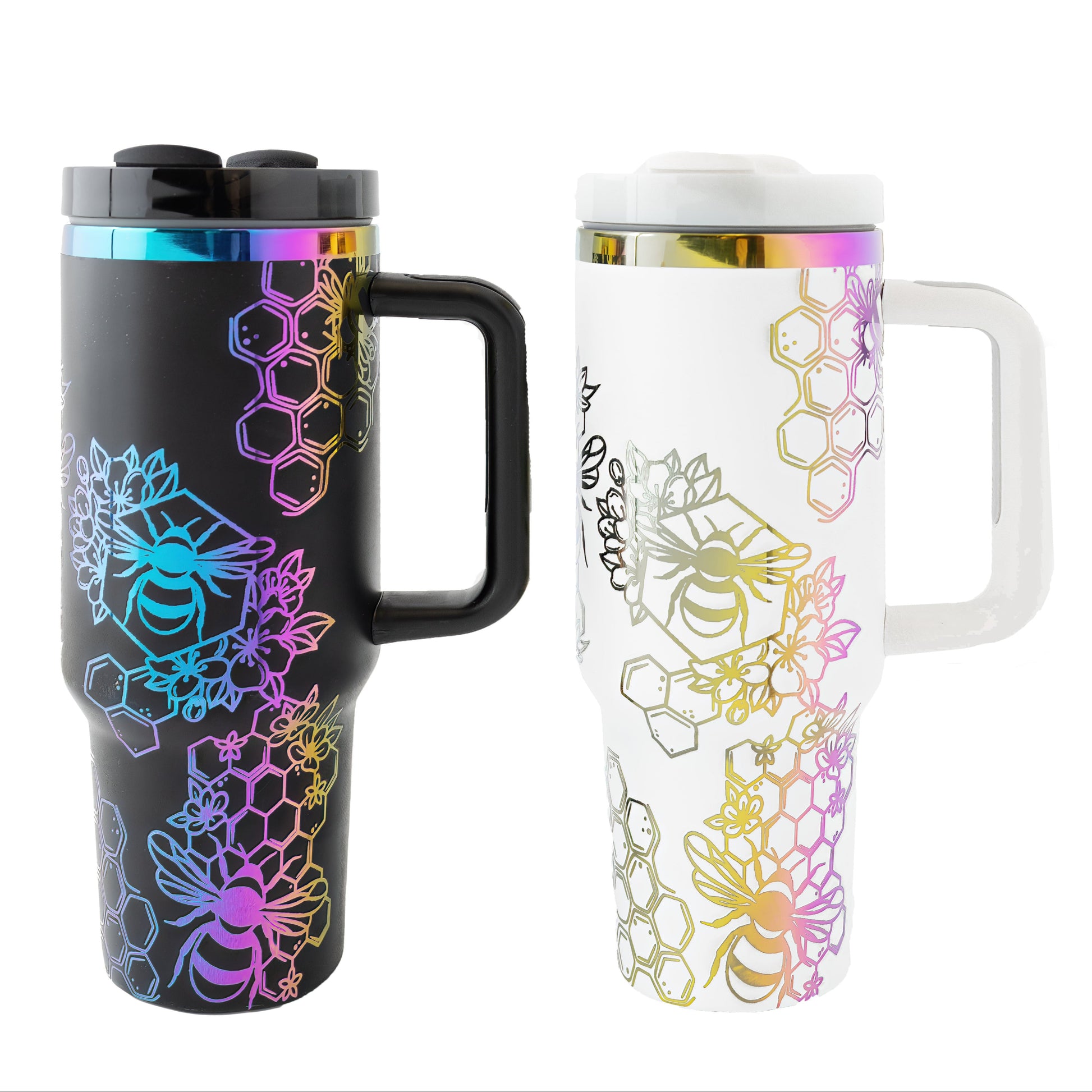 Bring a cheerful buzz to your daily routine with this stunning 40oz tumbler, laser engraved with a colorful rainbow honeycomb and bumble bee design. A charming and functional gift for nature lovers, gardeners, or anyone who enjoys a pop of positivity, this insulated tumbler keeps drinks hot or cold for hours.