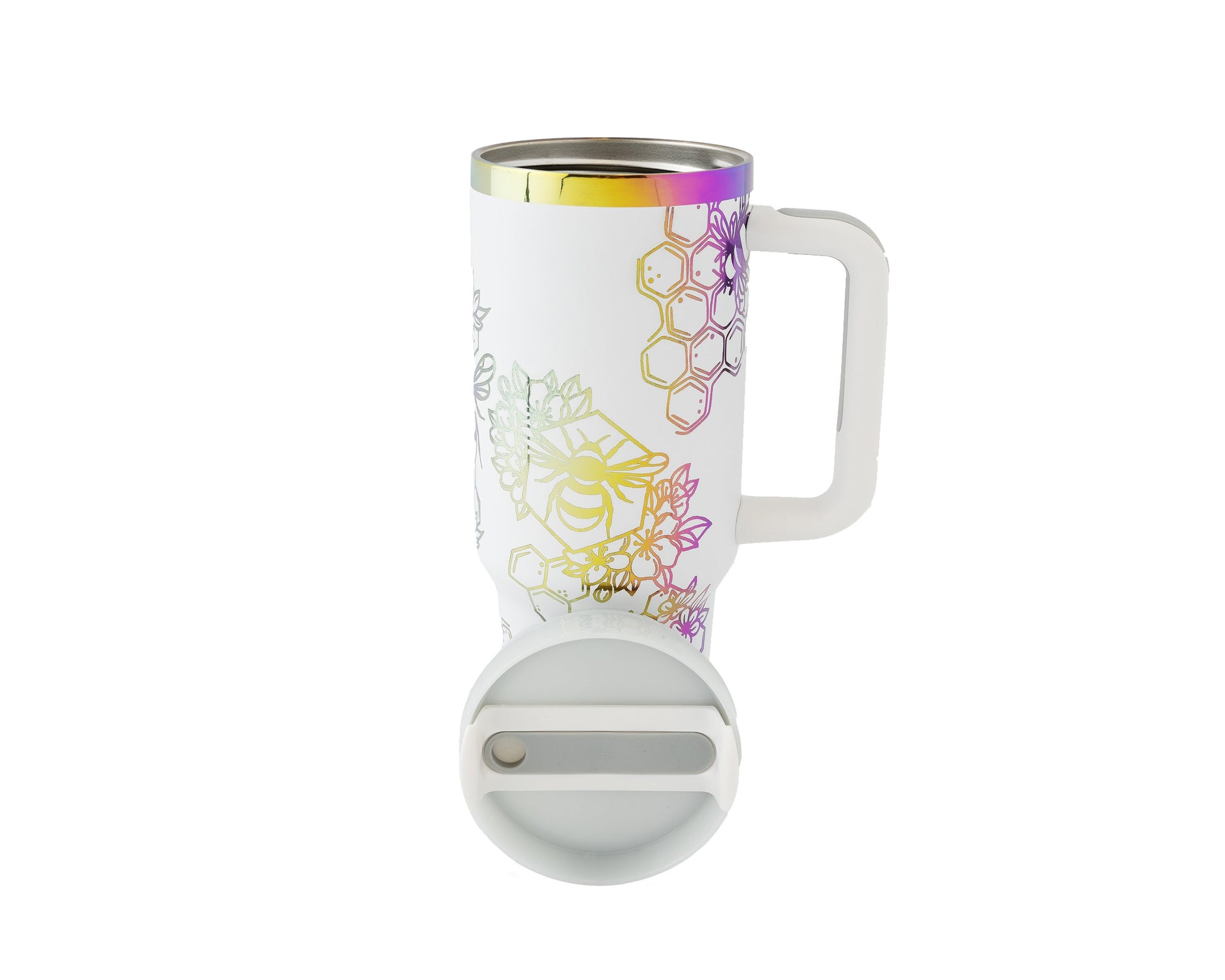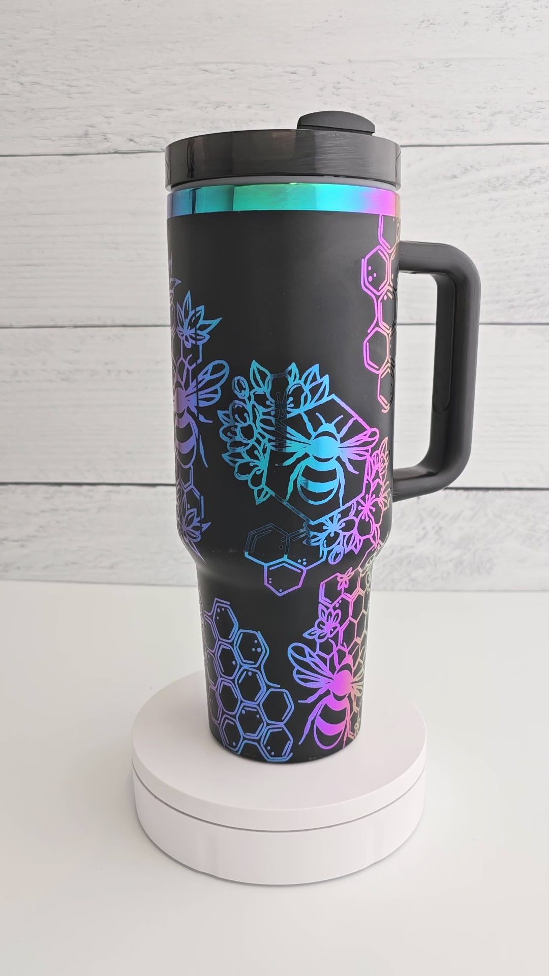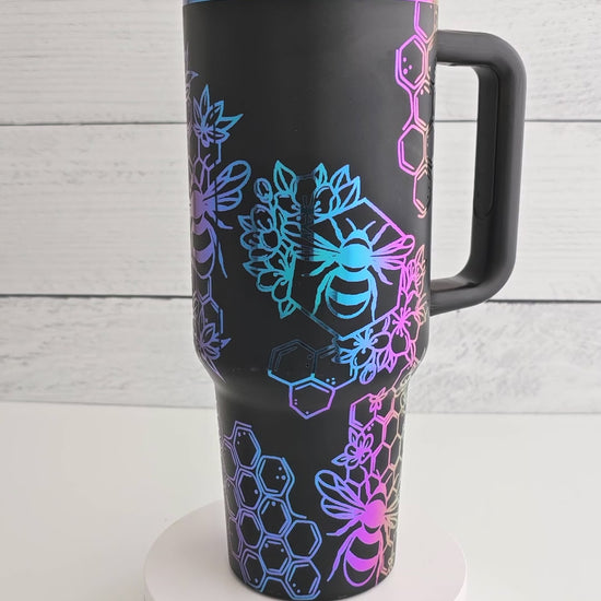 40oz Tumbler with Handle Laser Engraved with Bumble Bee and Honeycomb Design