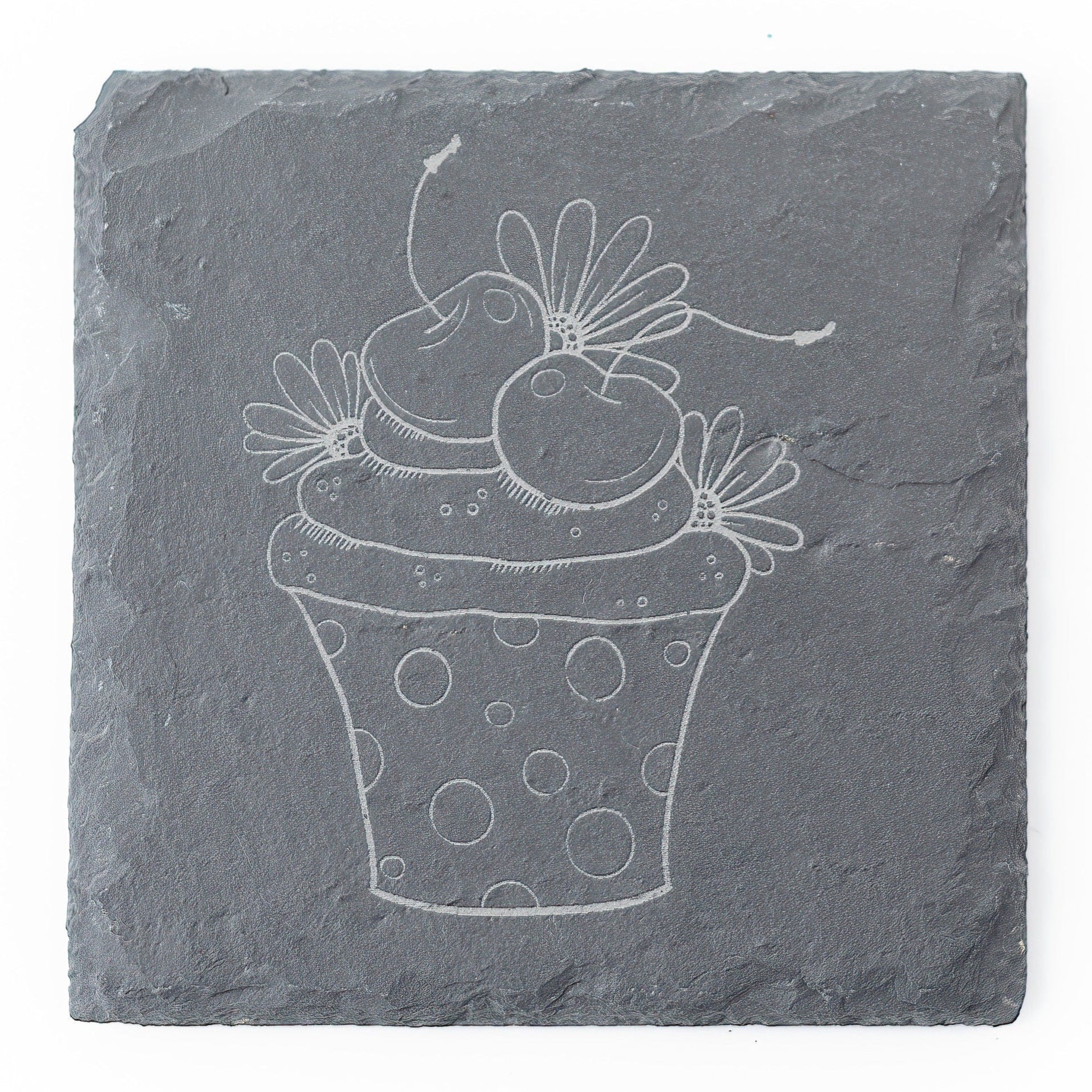 Sweeten up your kitchen or coffee table with this set of 4 natural slate coasters, each one laser engraved with a whimsical cupcake topped with cherries. This fun and functional set is a perfect treat for bakers, dessert lovers, or anyone with a sweet tooth.