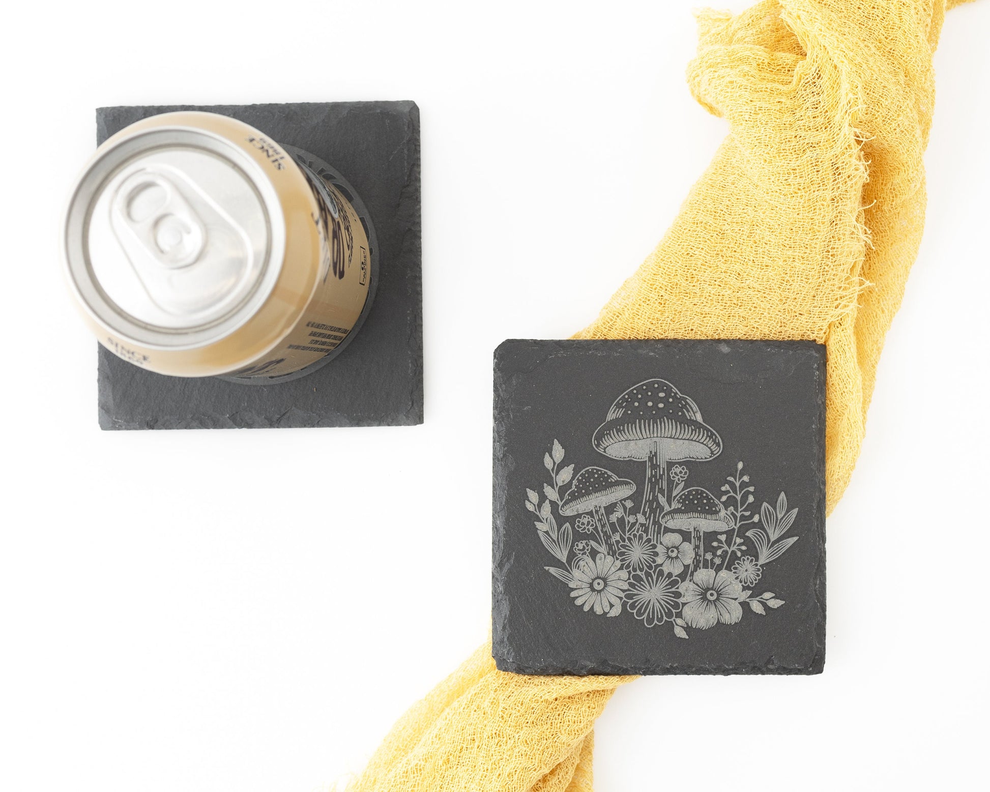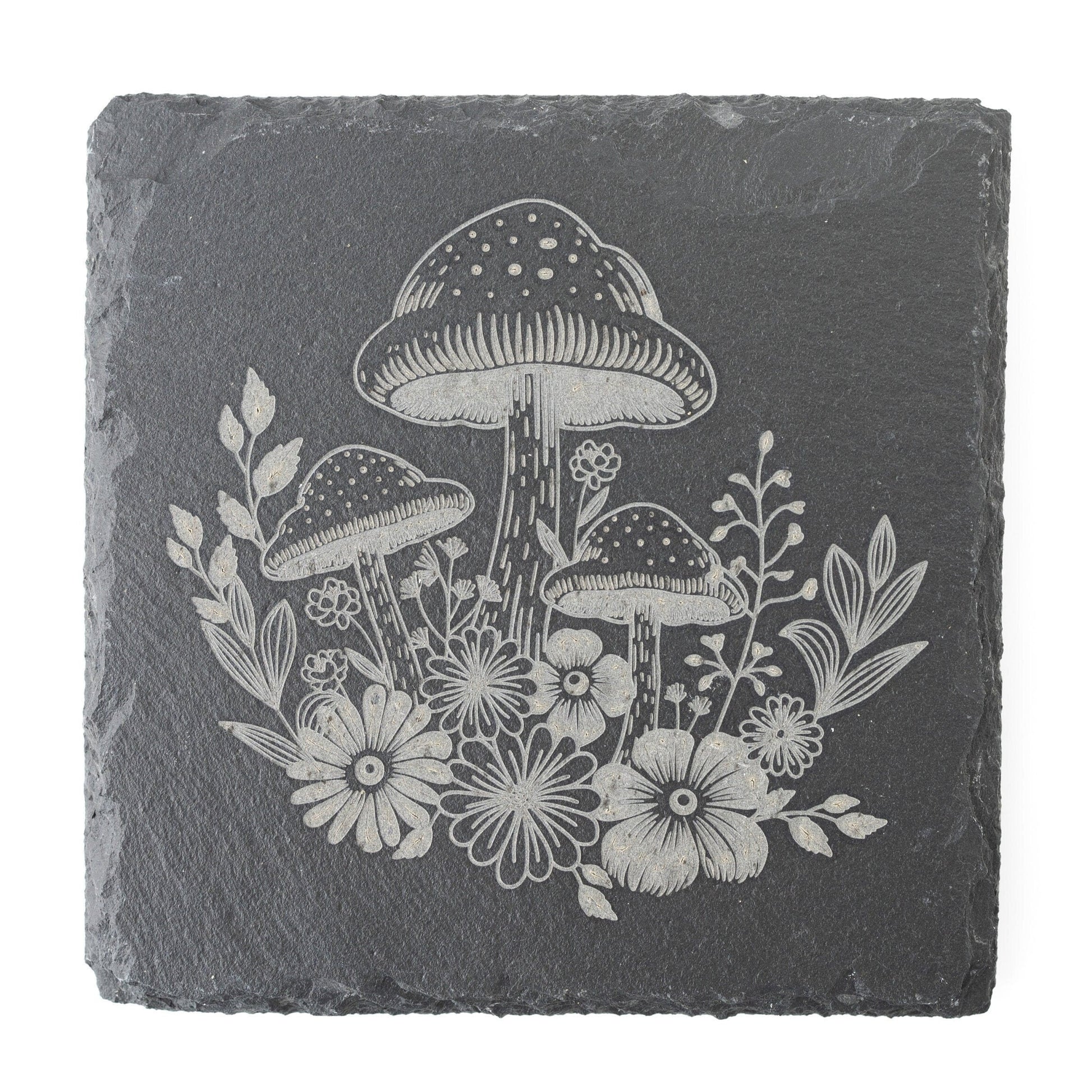 Engraved Slate Coasters – Set of 4 with Mushrooms & Floral Design