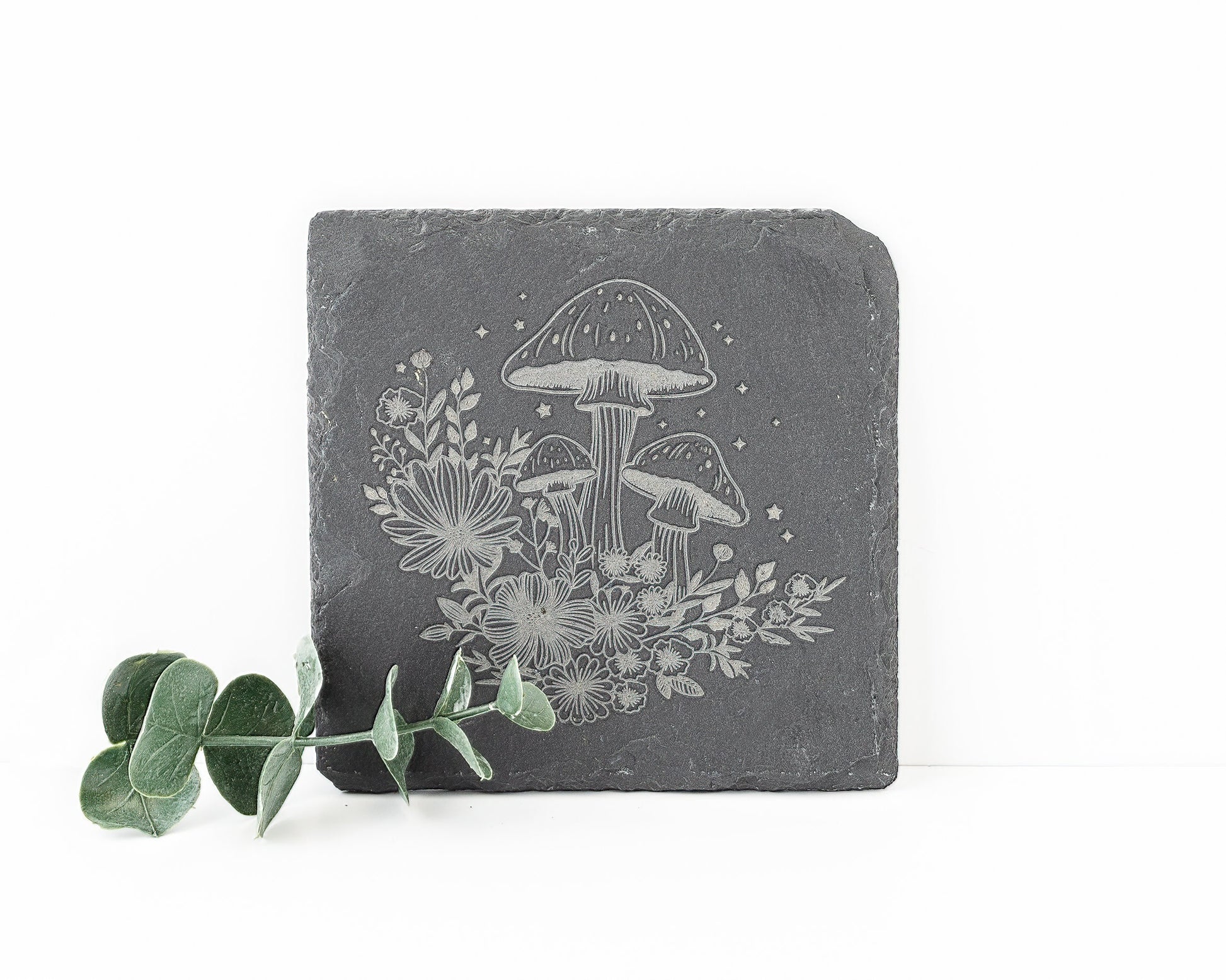 Add a touch of enchanted charm to your home with this set of 4 slate coasters, laser engraved with a graceful floral mushroom design. Perfect for fans of woodland whimsy and rustic elegance, this set makes a thoughtful gift for hosts, hostesses, or toadstool enthusiasts.