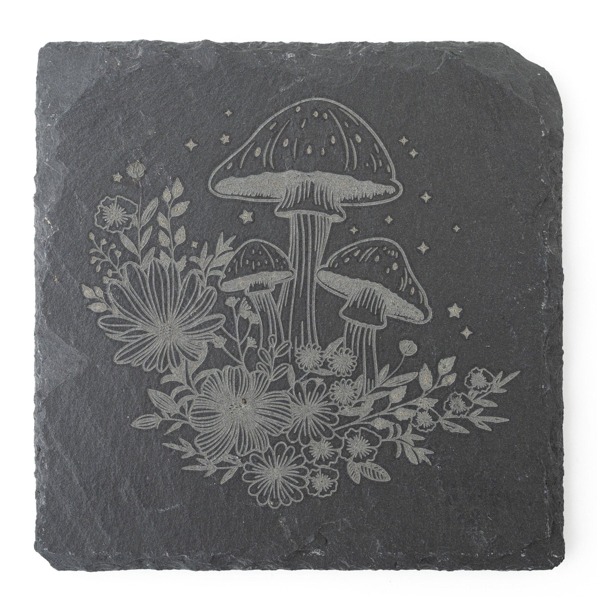 Crafted from genuine slate, each 4" x 4" coaster features a detailed engraving that blends the earthy look of mushrooms with delicate florals. The natural stone texture gives every piece a unique feel, while foam pads on the bottom help protect your surfaces from heat and scratches.
