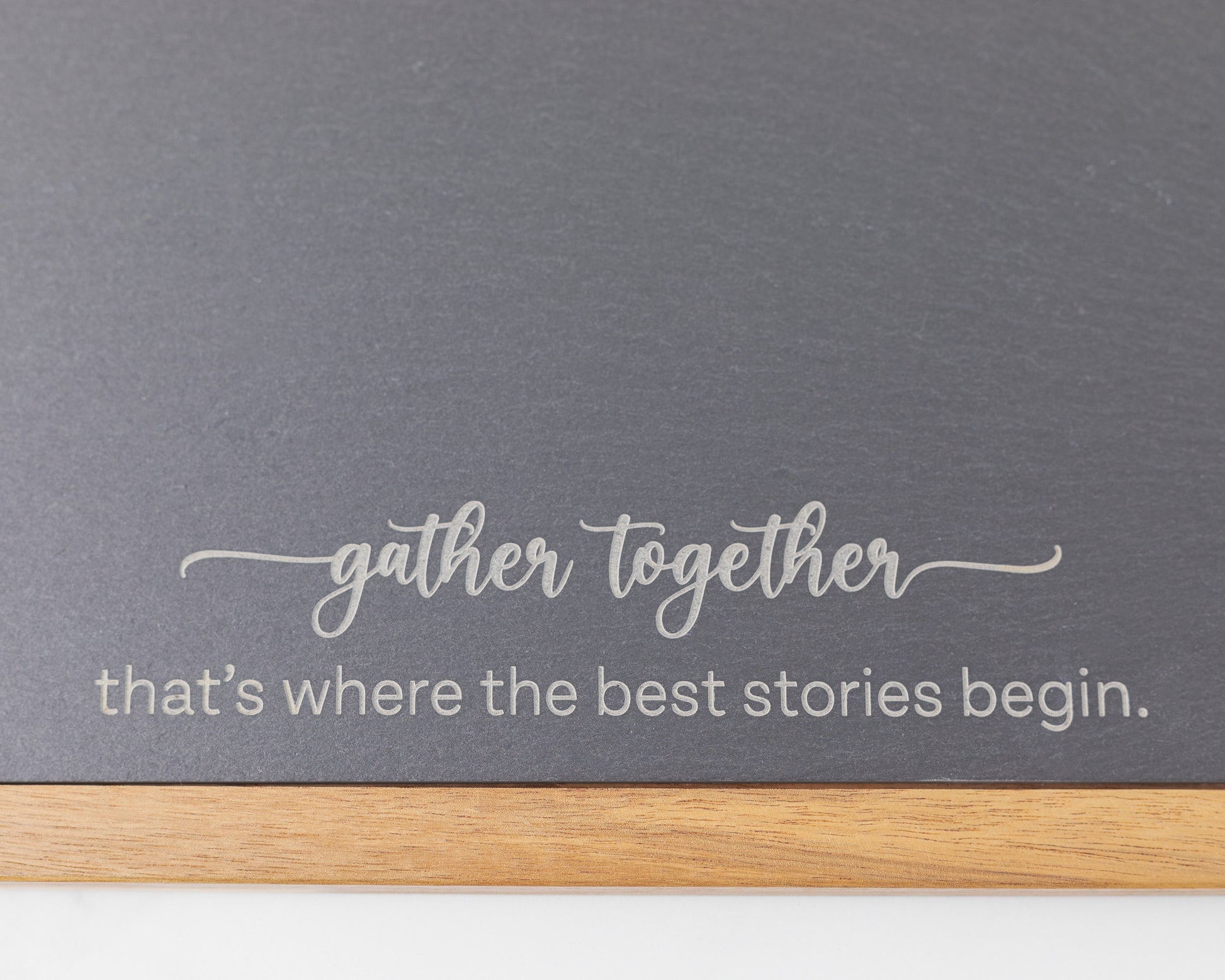 Slate center engraved with "Gather Together - that's where the best stories begin"