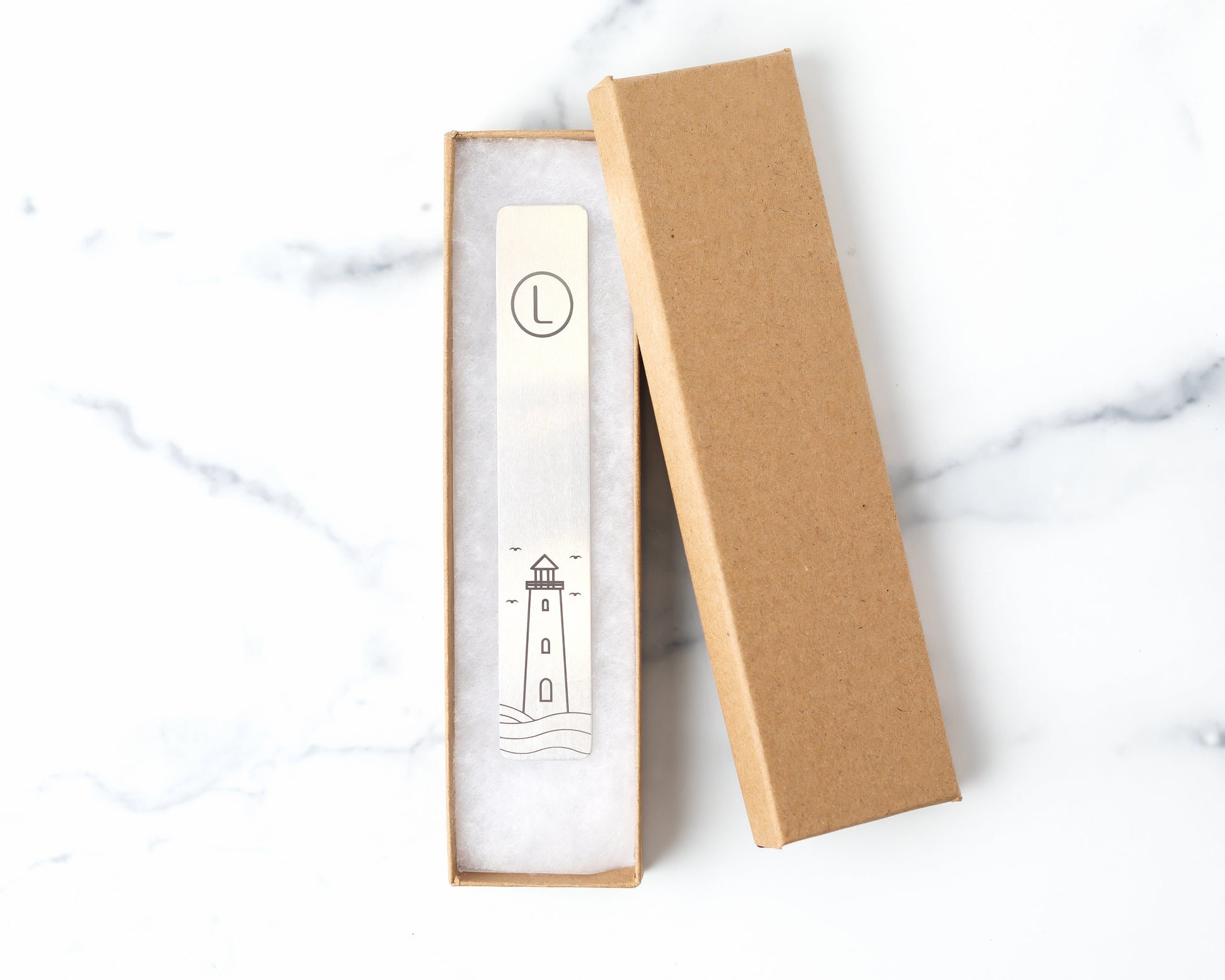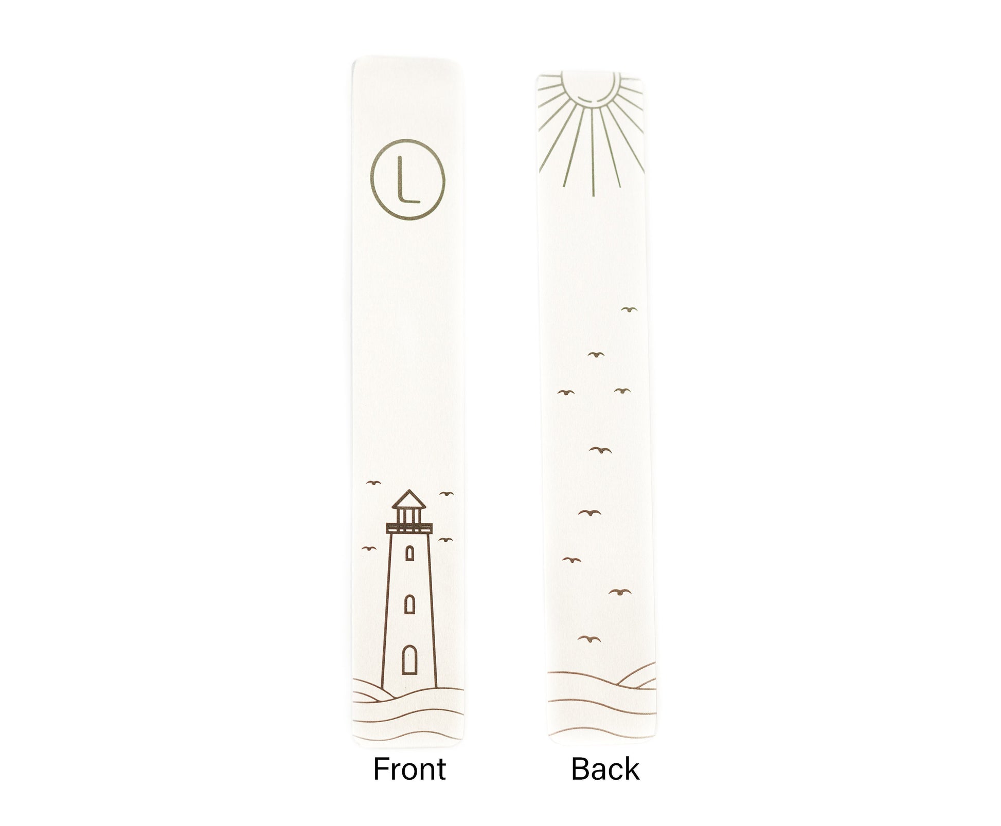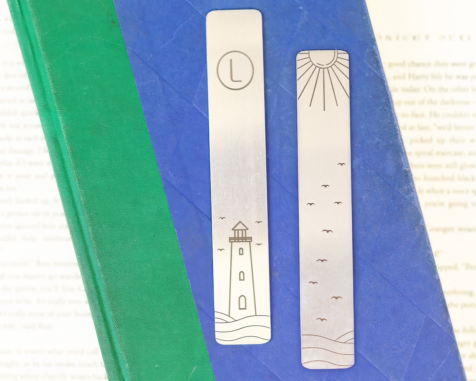 The front of the bookmark showcases your custom monogram alongside a detailed lighthouse, while the back features a tranquil coastal scene with waves, the sun, and soaring seagulls. Crafted from lightweight yet durable 16-gauge aluminum, this bookmark is built to last without bending or fading.
