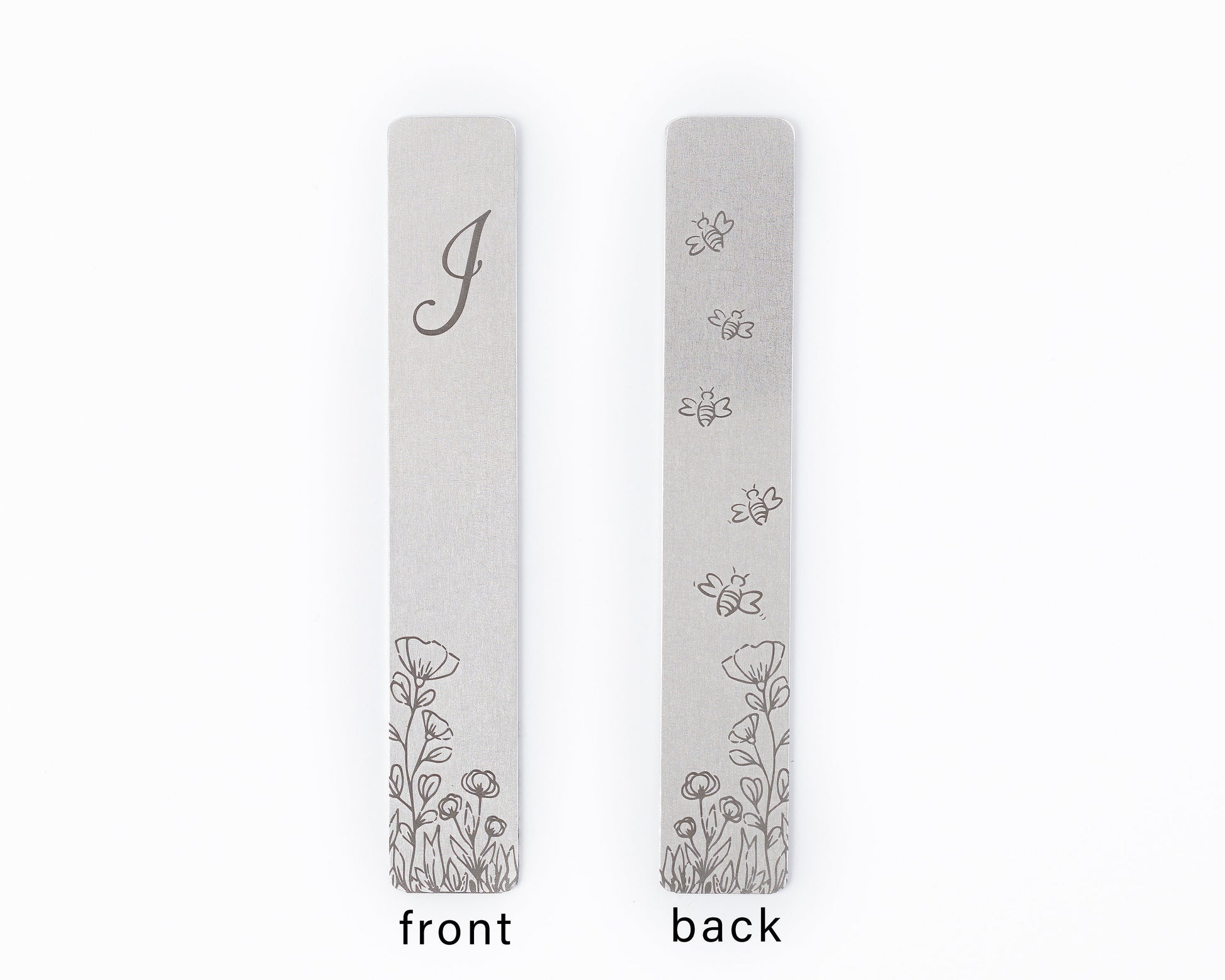 The front of the bookmark displays your custom monogram and wildflowers, while the back reveals a whimsical engraving of wildflowers and buzzing bees. Laser-engraved on durable 16-gauge aluminum, this lightweight bookmark is built to last through chapter after chapter.