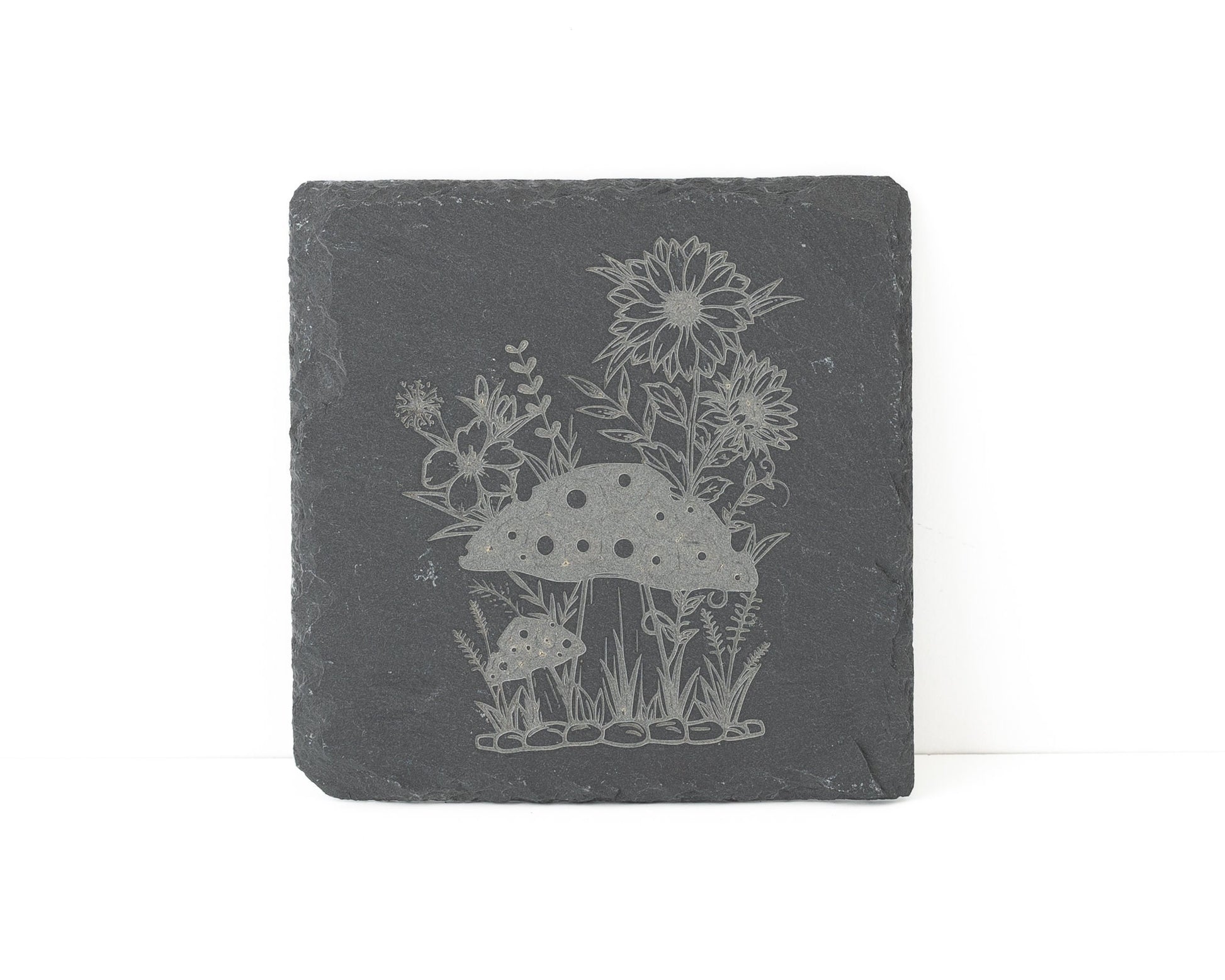 Mushroom & Sunflower Slate Coasters – Engraved Set of 4 for Nature Lovers