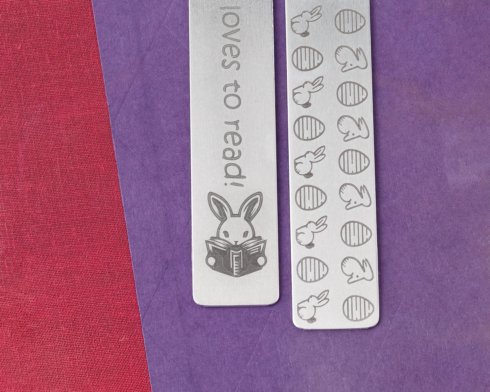 The front showcases a whimsical bunny reading a book alongside the engraved phrase, while the back is decorated with a delightful cascade of bunnies and Easter eggs. Made from durable 16-gauge aluminum, this bookmark is both lightweight and sturdy, designed to last through years of reading adventures.